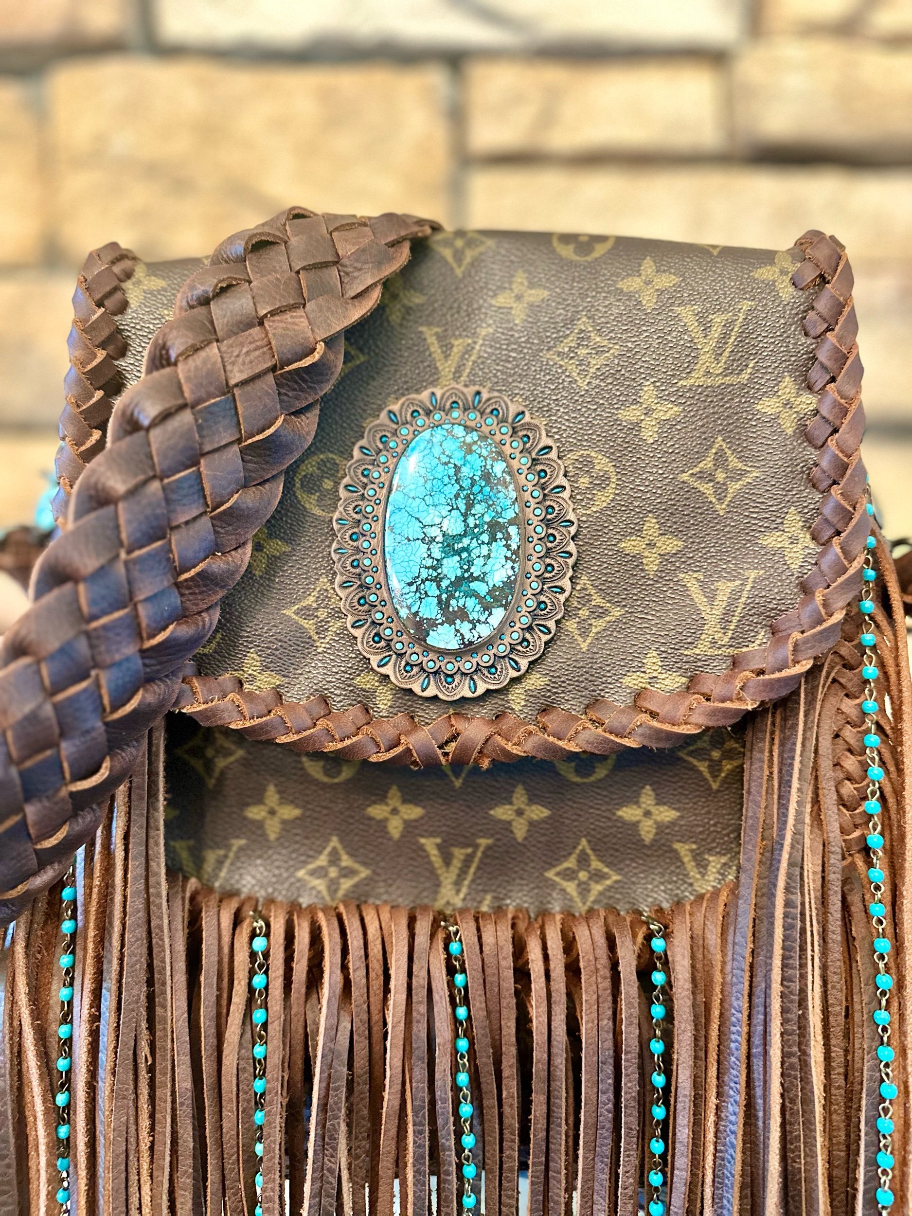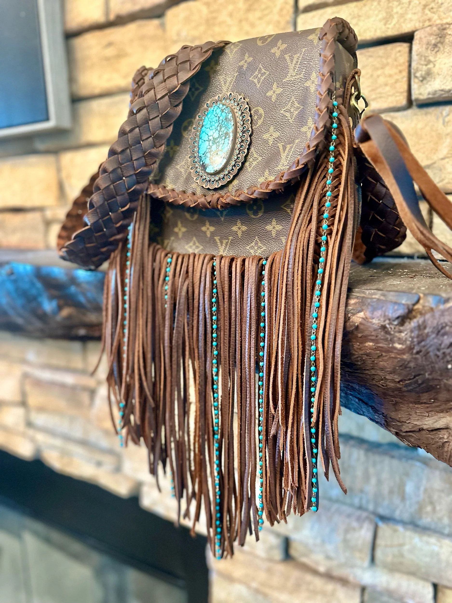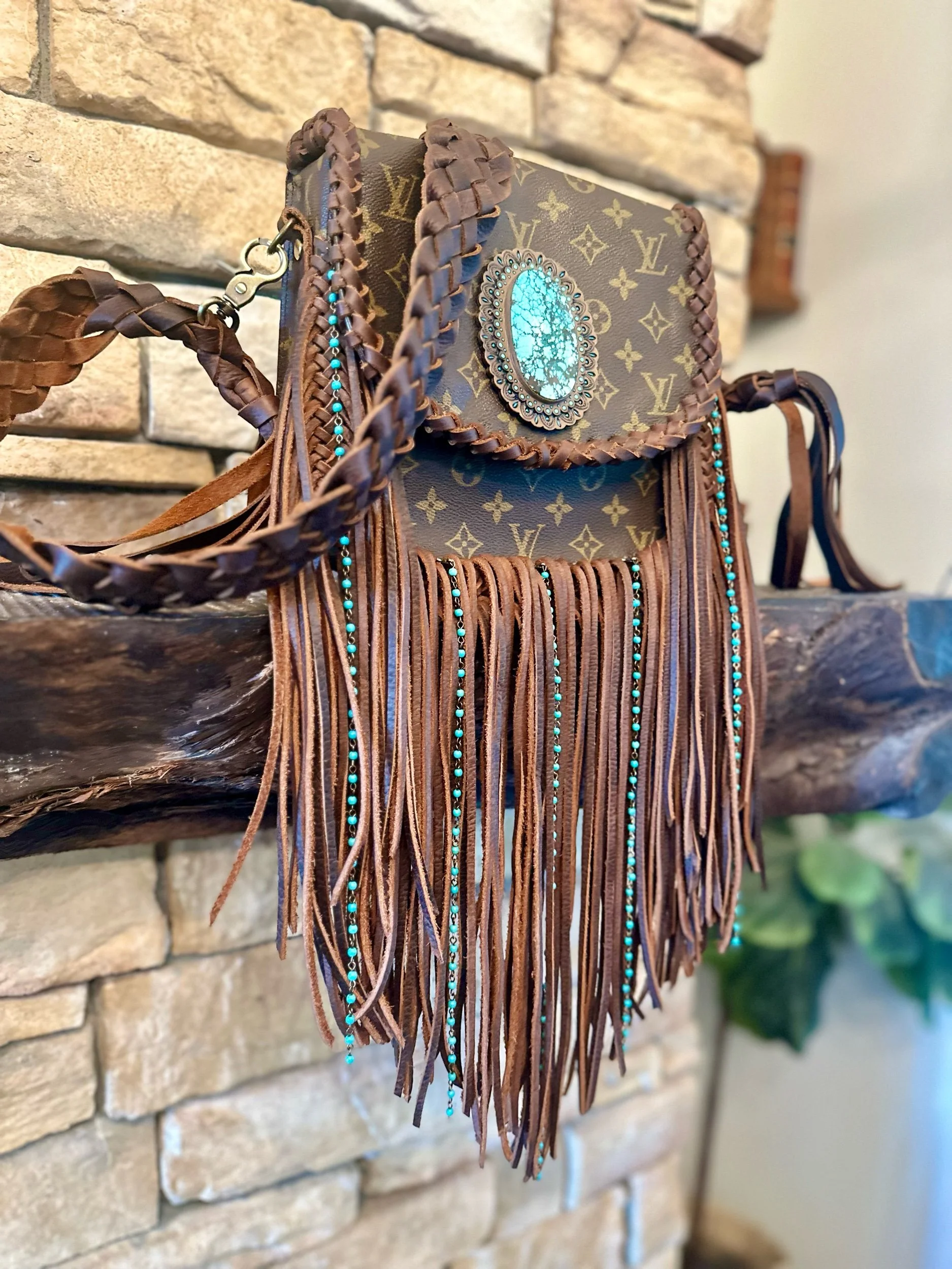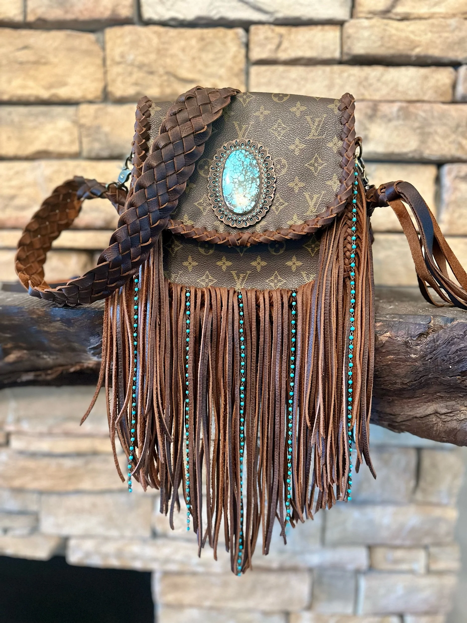 This beautiful one of a kind bag is about 9x9.5 with snap closure, one pocket inside and one on the bag. This one contains and one of a kind stone concho. Strap is average crossbody length.