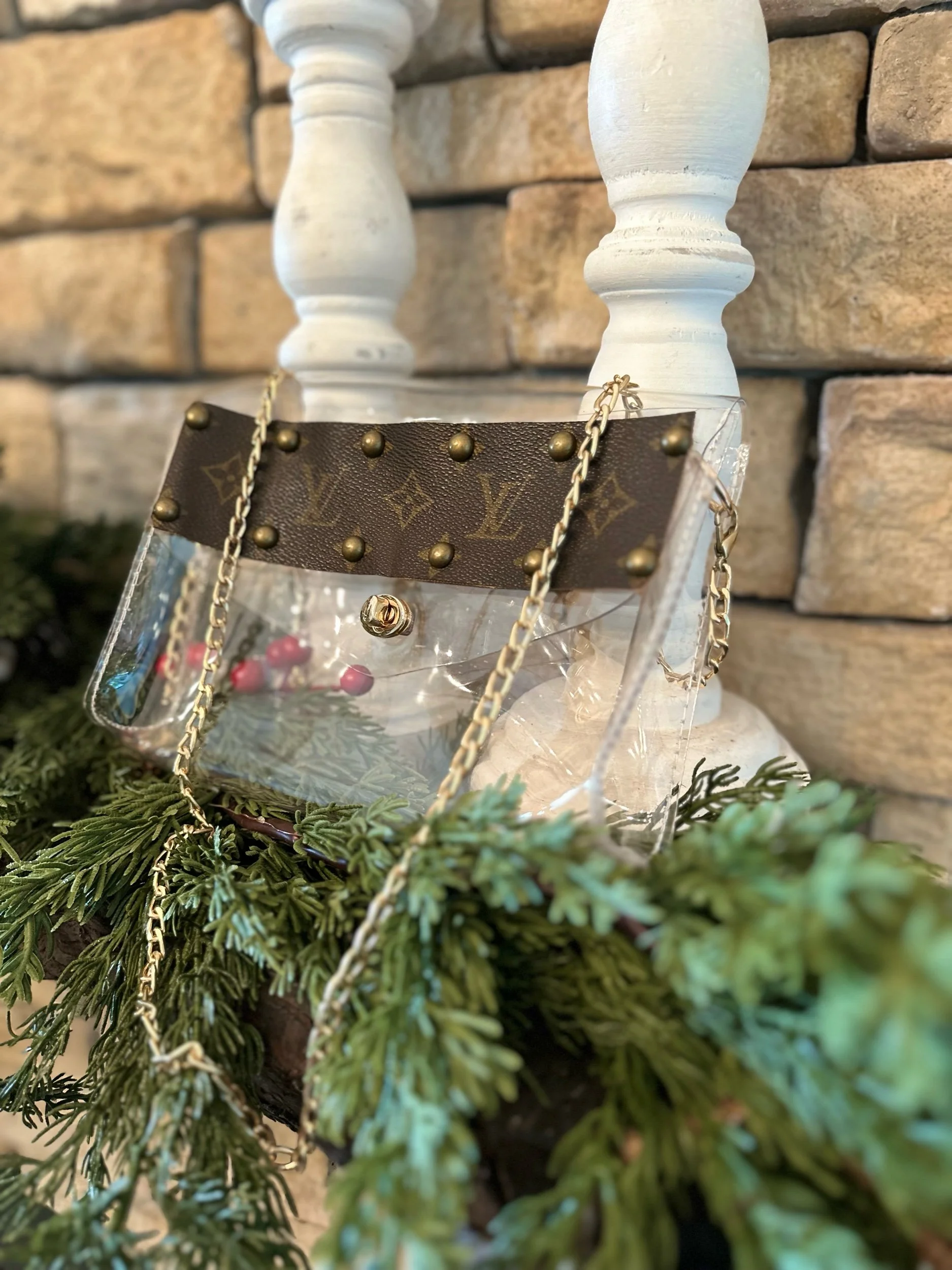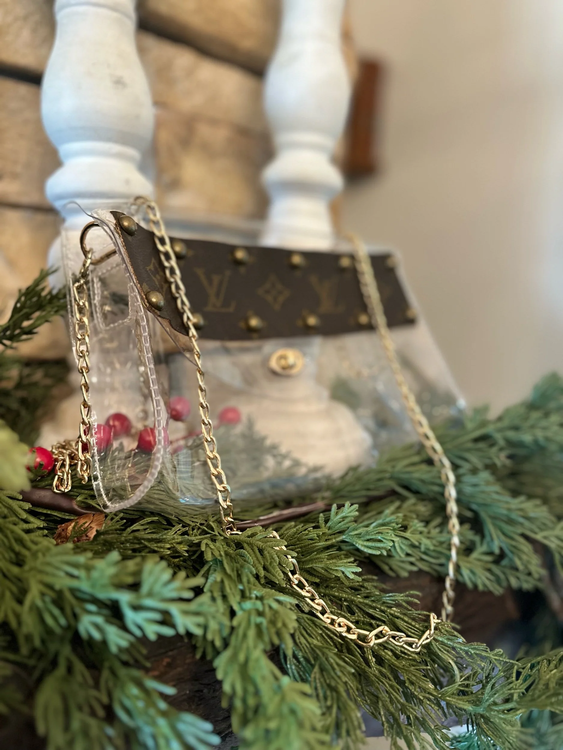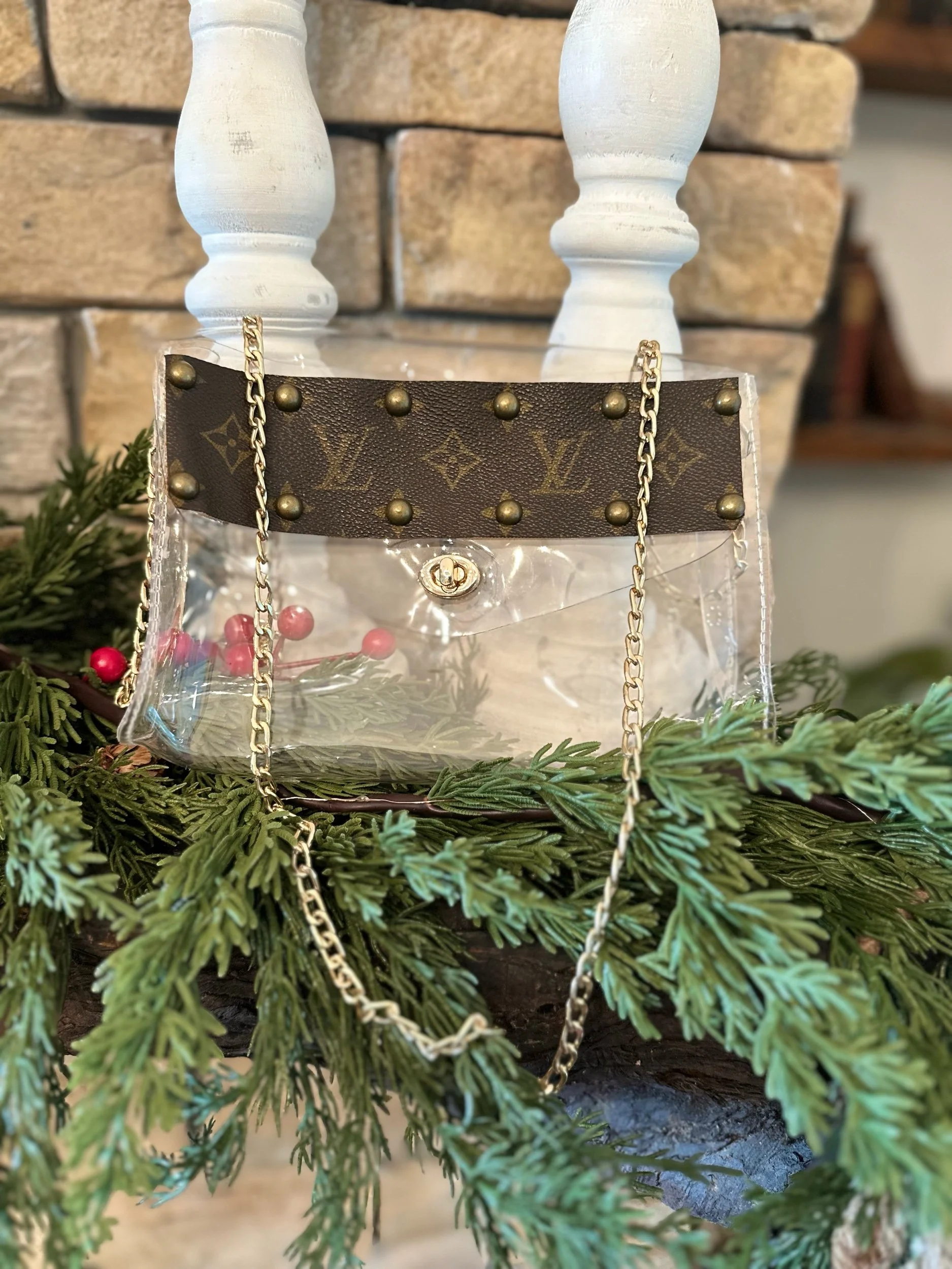 Shop Ready To Ship Bags › Fringeless Clear Stadium Bag Image 1 of 3 Image 2 of 3 Image 3 of 3 Fringeless Clear Stadium Bag $150.00 Clear stadium bag with authentic LV canvas added. Strap Is crossbody length. Quantity: Purchase Added! Clear stadium bag with authentic LV canvas added. Strap Is crossbody length.
