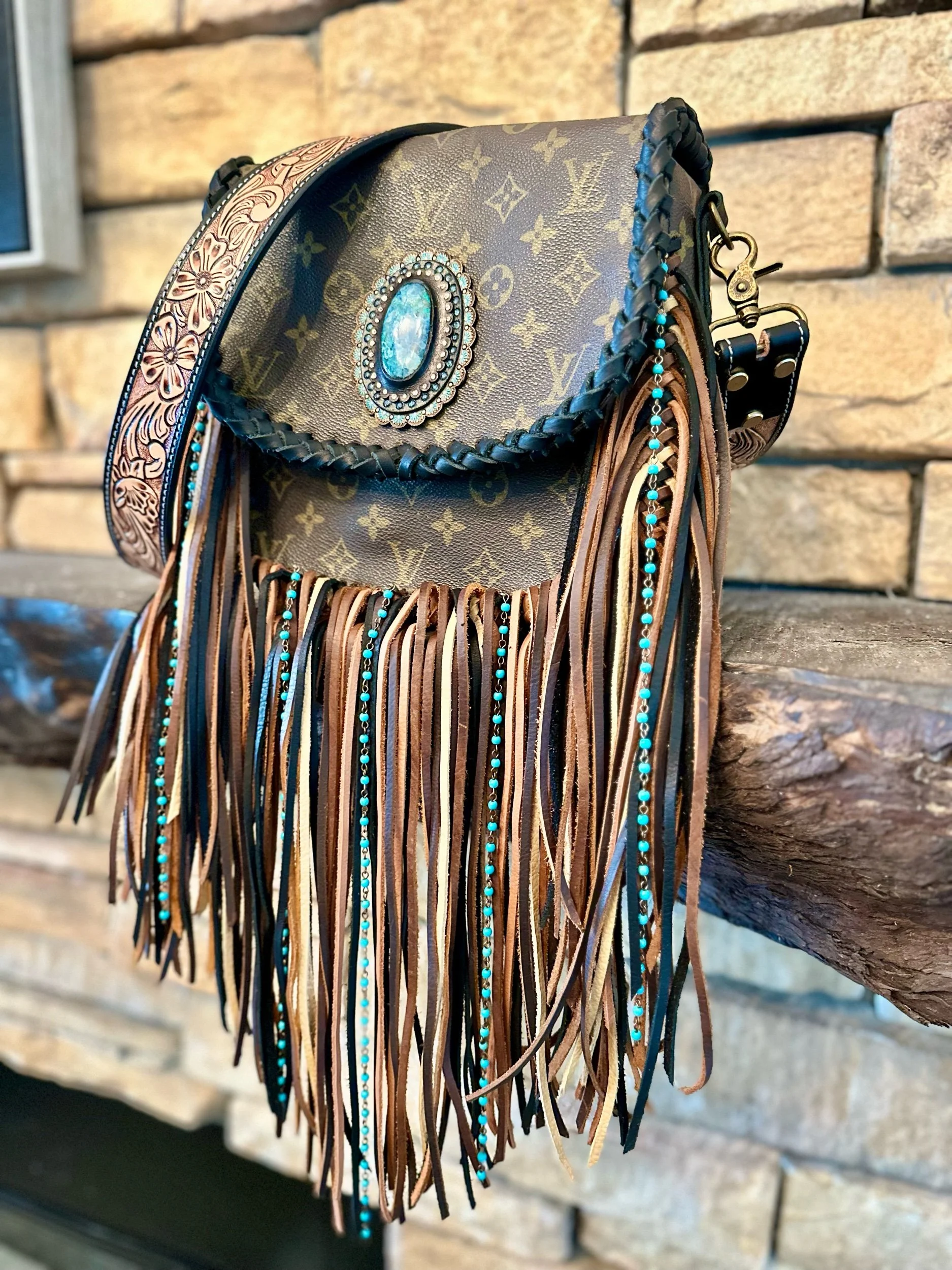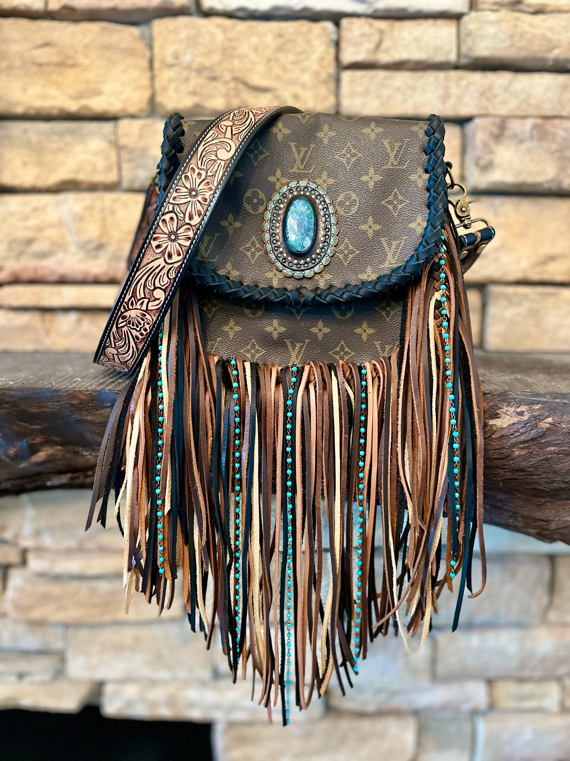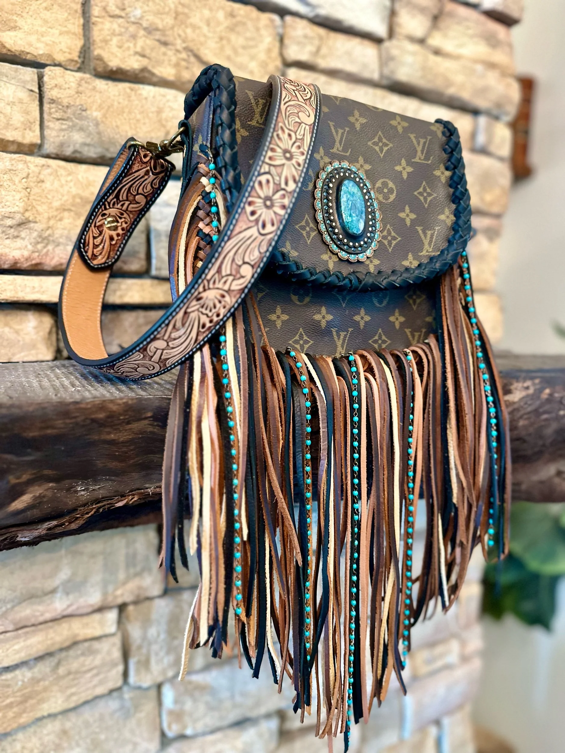 This bag is about 9x9.5 with snap closure. One pocket inside and one on the back. Strap is average crossbody length. This one contains a one of a kind stone concho.